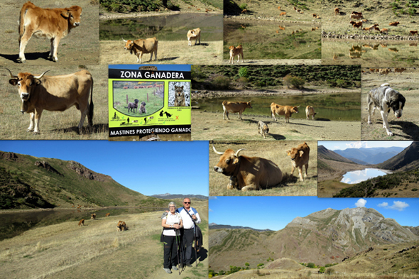 Tras pasar un buen rato en la feria y comprar ricos quesos, nos desplazamos unos 19 km hasta nuestro siguiente destino, la Laguna Grande, un lago de origen glaciar al que se accede desde la pequeña parroquia de Lago de Babia. La carretera concluye en un aparcamiento situado a escasa distancia del lago. Nada más salir del coche se nos acercaron dos mastines, lo que nos hizo tomar precauciones, aunque pronto vimos que venían en plan pacífico, dejándose acariciar, cosa que no se debe hacer según los consejos que vimos después en un panel. Estaban cuidando a un grupo de vacas que pastaban junto al lago, con sus terneros, a los que tampoco conviene acercarse cuando hay mastines. Fue la más hermosa estampa de esta escapada. Subimos luego a un collado, rodeado de montañas, desde donde contemplamos el cañón del río Sil.