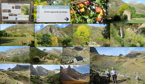 Iniciamos la jornada del 15 de octubre desplazándonos 12 km (todo está cerca) hasta la localidad de Torre de Babia. Dejamos aparcado el coche junto a la fuente situada a la entrada del pueblo, de donde parte la Ruta Laguna de Las Verdes (sendero PR-LE 73), distante 5,3 km, con un desnivel de 470 metros, un recorrido en el que entre ida y vuelta se tarda unas 4 horas. Hoy toca disfrutar de pleno de la comarca de Babia, declarada Reserva de la Biosfera por la UNESCO en el año 2004. Buena parte de la ruta se realiza por una pista, desde la que contemplamos al fondo del valle la cascada de Treméu. La pista se bifurca hacia la izquierda cuando llevamos 2,5 km y concluye en la majada de Las Verdes, teniendo que seguir por un estrecho y a veces difuso sendero hasta la Laguna de las Verdes, así llamada por estar completamente cubierta de vegetación, aunque con la sequía que hay en la zona ahora era ocre. Aunque el sendero es circular, regresamos al punto de partida por la misma ruta de subida.