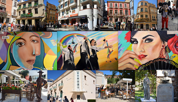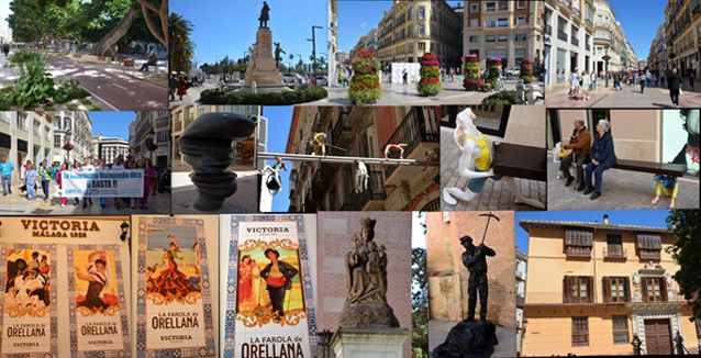 Consultamos cuáles eran las mejores zonas de Málaga para picar algo, así que como se había echado la hora de comer, nos dirigimos a una de ellas pues la teníamos muy cerca. Se trata de la animada calle Granada, peatonal y con numerosos locales hosteleros. Casi en la esquina con la plaza del Carbón, degustamos un par de raciones en La Quintonería Majreta, para luego continuar nuestro recorrido, observando unos murales, hacia los Cines Albéniz, frente a los que se encentra la estatua dedicada al filósofo y poeta local Salomón Bel Gabirol. No había mucha gente en la calle pero, cuando volvimos dos días después, viernes, estaba abarrotada.