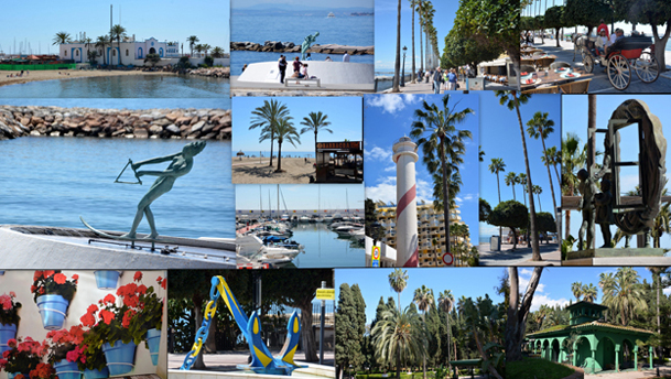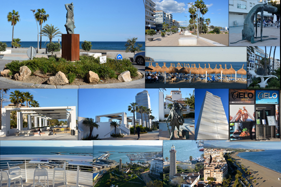 La siguiente parada la tuvimos 37 km después en Marbella, población en la que en un anterior viaje nos gustó su casco antiguo. Dejamos el coche en el Parking APK2 Arias Maldonado, situado en la calle del mismo nombre, bastante cerca de la oficina de turismo, ubicada muy cerca junto al Paseo Marítimo, donde hicimos una pausa en la terraza de un bar. Caminamos por el paseo hasta la playa del Faro, donde se encuentra la estatua de Venus haciendo esquí acuático. Desde allí observamos al fondo la costa africana.