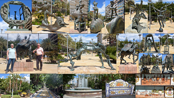 Enseguida abandonamos el paseo para caminar por otro lugar emblemático de Marbella, la avenida del Mar, un paseo peatonal que nos conduce al casco antiguo y que se ha convertido en un mueso al aire libre, pues su parte central la adornan un buen grupo de surrealistas esculturas de bronce obra de Salvador Dalí. Esta avenida conduce sin solución de continuidad al parque de la Alameda, un oasis en el centro de la ciudad, que cuenta con abundante arbolado, bancos decorados y una coqueta fuente central.
