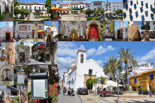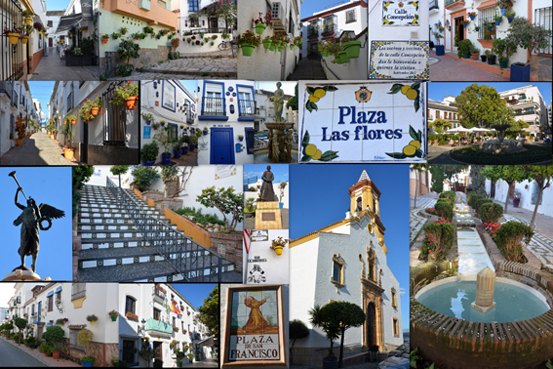 La siguiente cita la tuvimos a 33 km, en una localidad que no conocía, Estepona, cuyo casco antiguo es un buen ejemplo de pueblo andaluz, con casas encaladas adornadas con numerosas macetas con flores, así que deambulamos por sus calles, como el pasaje Maruja Mallo y la calle Concepción, con rumbo a un lugar icónico de Estepona, la plaza de las Flores. También nos acercamos a la iglesia de Ntra Sra de los Remedios, remodelada en 1772. Frente a ella se encuentra la estatua de uno de sus párrocos, Manuel Sánchez.