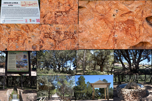 Más lejos del centro de Alpera se encuentra su principal atractivo, que hay que visitar  con guía. Se trata de la Cueva de la Vieja, un abrigo de notables dimensiones que desde 1998 forma parte del Patrimonio de la Humanidad de la UNESCO. Cuenta con 170 imágenes, entre las que destacan 33 arqueros, 15 ciervos, 10 cabras, 5 toros y un caballo. Tras comer en un bar de la población, volvimos a las afueras para bajar la comida caminando por el Parque de la Mejorada, de 12 hectáreas de extensión y ejemplares de gran edad de pino carrasco y encinas. En una esquina del parque se encuentra el Templete de la Santa Cruz.