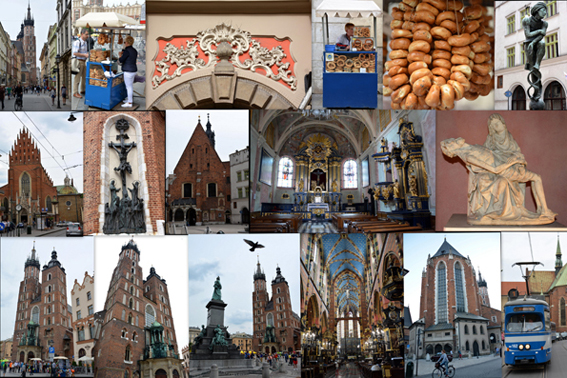Nos detenemos en primer lugar en un puesto de Obwarzanek Krakowski, un pan en forma de anillo, similar a un bagel, pero trenzado y hecho con una masa que se hierve antes de hornearla. Cracovia cuenta con 120 iglesias católicas, visitando en primer lugar dos de ellas, comenzando por la de Santa Bárbara, gótica de finales del siglo XIV, que cuenta en su interior con la escultura la Pietà. La siguiente cita la tuvimos en la iglesia que más me gusta, la Basílica de Santa María, con sus dos elegantes torres y el retablo de Veit Stoss. Abre de lunes a sábado de 11:30 a 18 y domingos y festivos de 14 a 18 h. Casi al lado está la iglesia de Santa Bárbara y la estatua del estudiante pobre.
