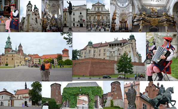 Todavía nos quedaban otras dos iglesias por visitar. Caminando 600 metros llegamos a la románica de San Andrés, del siglo XI, a la que se le añadieron dos torres barrocas en el siglo XVII. Su decoración interior también es barroca. Al lado tenemos de San Pedro y San Pablo obra maestra de la arquitectura barroca polaca, construida entre 1597 y 1619. Nuestro destino se encuentra 300 metros más adelante sobre una colina desde el siglo XI. Se trata del Castillo Real de Wawel. Los apartamentos reales abren de martes a domingo de 9:30 a 17 h, aunque no entramos por falta de tiempo. En el mismo recinto tenemos la Catedral de Wawel (abre todos los días de 9 a 16 h), la estatua de Juan Pablo II y la escultura ecuestre de Tadeusz Kościuszko, uno de los monumentos de bronce más conocidos de Polonia.
