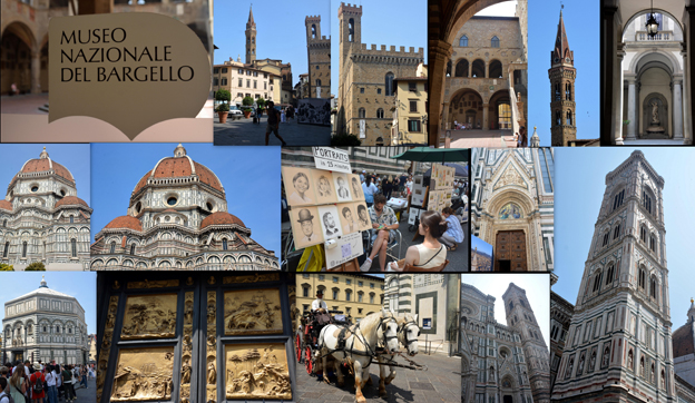 Concluida la visita a la Basílica, empezamos a recorrer el centro histórico pasando junto al Museo Nazionale del Bargello que cuenta con un monumental edificio y varias ubicaciones. Nuestro destino era la piazza del Duomo, abarrotada de gente que hacía una larga cola para acceder al interior de la Catedral, una de las más grandes del mundo, cuya entrada es gratuita. Como ya estuvimos en un viaje anterior, nos limitamos a contemplarla desde fuera. Lo mismo hicimos con el Battistero di San Giovanni, revestido de mármol, y el Campanile de Giotto, de 82 metros, pudiéndose acceder a lo alto tras subir 414 escaleras.