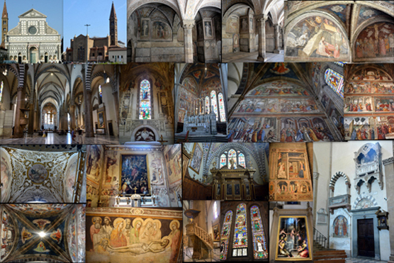 Tras comer en las proximidades del mercado y dado el insoportable calor que padecimos, nos dirigimos a la Basílica de Santa María Novella, distante tan solo 400 metros, que abre de 9 a 17:30 h, costando la entrada 7,50 €. Declarada Patrimonio de la Humanidad por la UNESCO, la iglesia se levantó en diferentes fases, entre los siglos XIII y XV, destacando su imponente fachada renacentista de mármol. Se accede por una especie de pórticos decorados con frescos, que nos conducen a la gótica nave central. Detrás del altar está la capilla Tornabuoni, cuyos frescos son de Domenico Ghirlandaio. Otros frescos notables son los de Filippino Lippi en la capilla Strozzi.